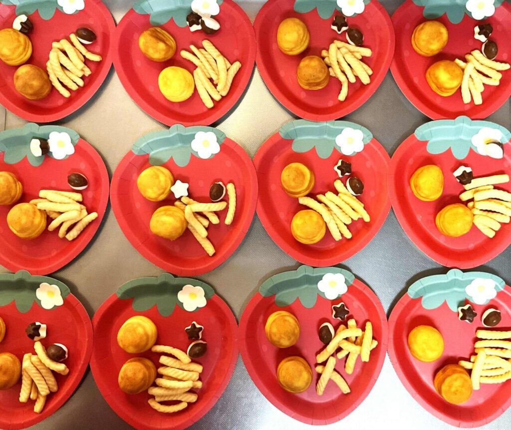 こばとでは、いちごのプレートに当日のおやつとえびせんなどを添えて、皆さんの元へお届けしました。