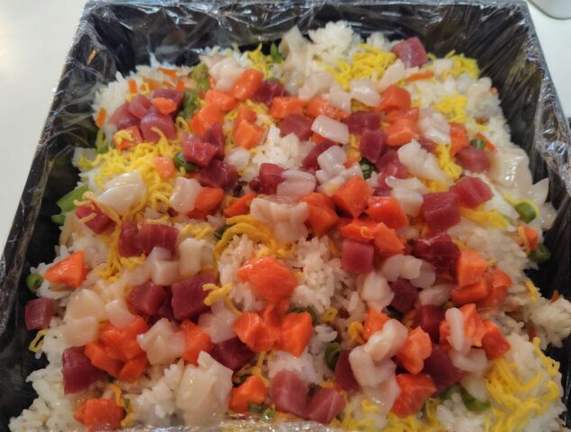 メニューは、彩り豊かな海鮮バラ散しをはじめ、やわらかいサイコロステーキ、人気のグラタン2種類、サラダ2種類、そしてデザートまで揃った、盛りだくさんの内容でした。