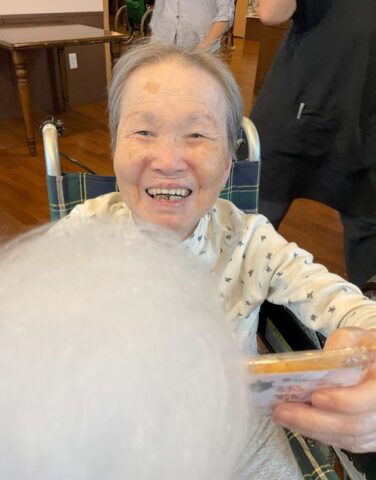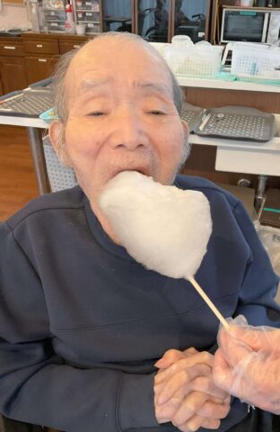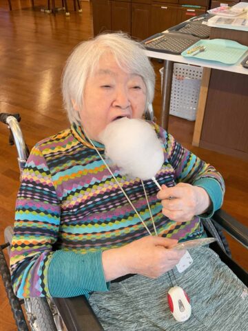 皆さん大好きな「綿菓子」です。職員がひとつひとつ手作りをしている機械の周りに集まって「綿あめ?懐かしいね。」「こうやってできるんだね。」などと興味津々。大喜びで召し上がっていました。思い出がよみがえってきたのか涙ぐまれる方もいらっしゃったそうです。