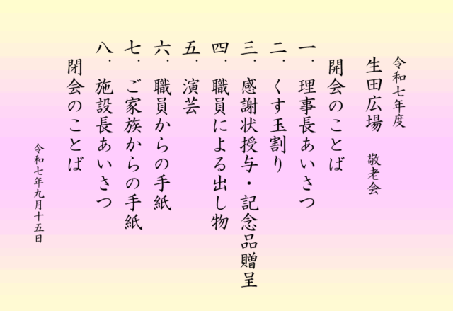 今後も生田広場に集う皆さまおひとりおひとりがご自分らしく、温かく穏やかに時を重ねることができますよう職員一同努めさせていただきます。今後ともよろしくお願いいたします。