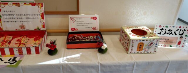 ご利用者はおせち料理を楽しまれ、施設内に設けた神社へお詣りされるなど、ゆったりとしたお正月の時間を過ごされています。また、面会に来られたご家族との楽しそうな会話や笑い声も聞かれ、私たちも温かく和やかな気持ちでお仕事をさせていただいています。