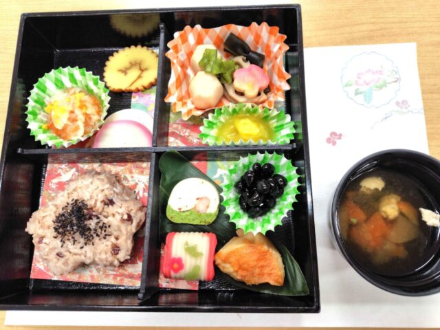 ご利用者はおせち料理を楽しまれ、施設内に設けた神社へお詣りされるなど、ゆったりとしたお正月の時間を過ごされています。また、面会に来られたご家族との楽しそうな会話や笑い声も聞かれ、私たちも温かく和やかな気持ちでお仕事をさせていただいています。