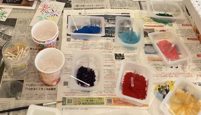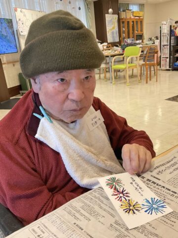 今回ご利用者が取り組んだ暑中はがきの作成は、切れ目を入れたプラスチックのストローに絵の具をつけスタンプしたり、綿棒や絵筆🖌️を使って花火🎆をデザインしました。色の選び方や重ね方によって印象が違い、お好みや個性が出てそれぞれに素敵な作品になりました。