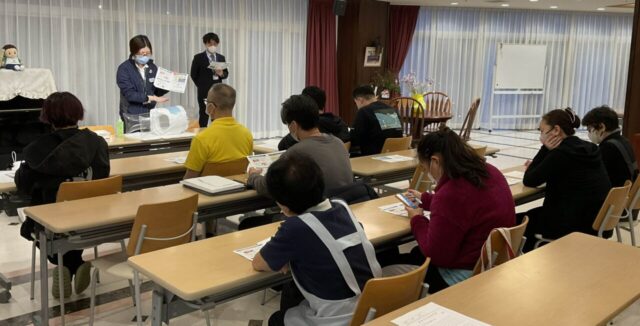 ※写真は排泄ケア研修の様子(翻訳アプリを使って内容を確認する姿も見られました)