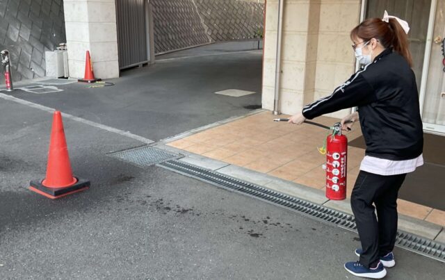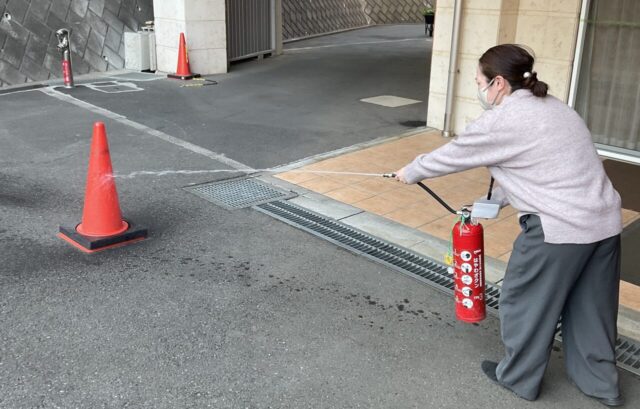 消火訓練では、水消火器を使って、消火器の使い方を実際に体験しました。