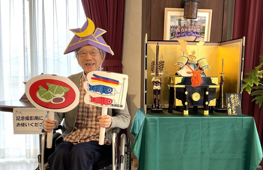 館内の多目的ホールには兜を飾り、端午の節句の雰囲気を楽しんでいただいています。フォトスポットでは、季節を感じられる小物を手に、皆さま素敵な笑顔を見せてくださっています。